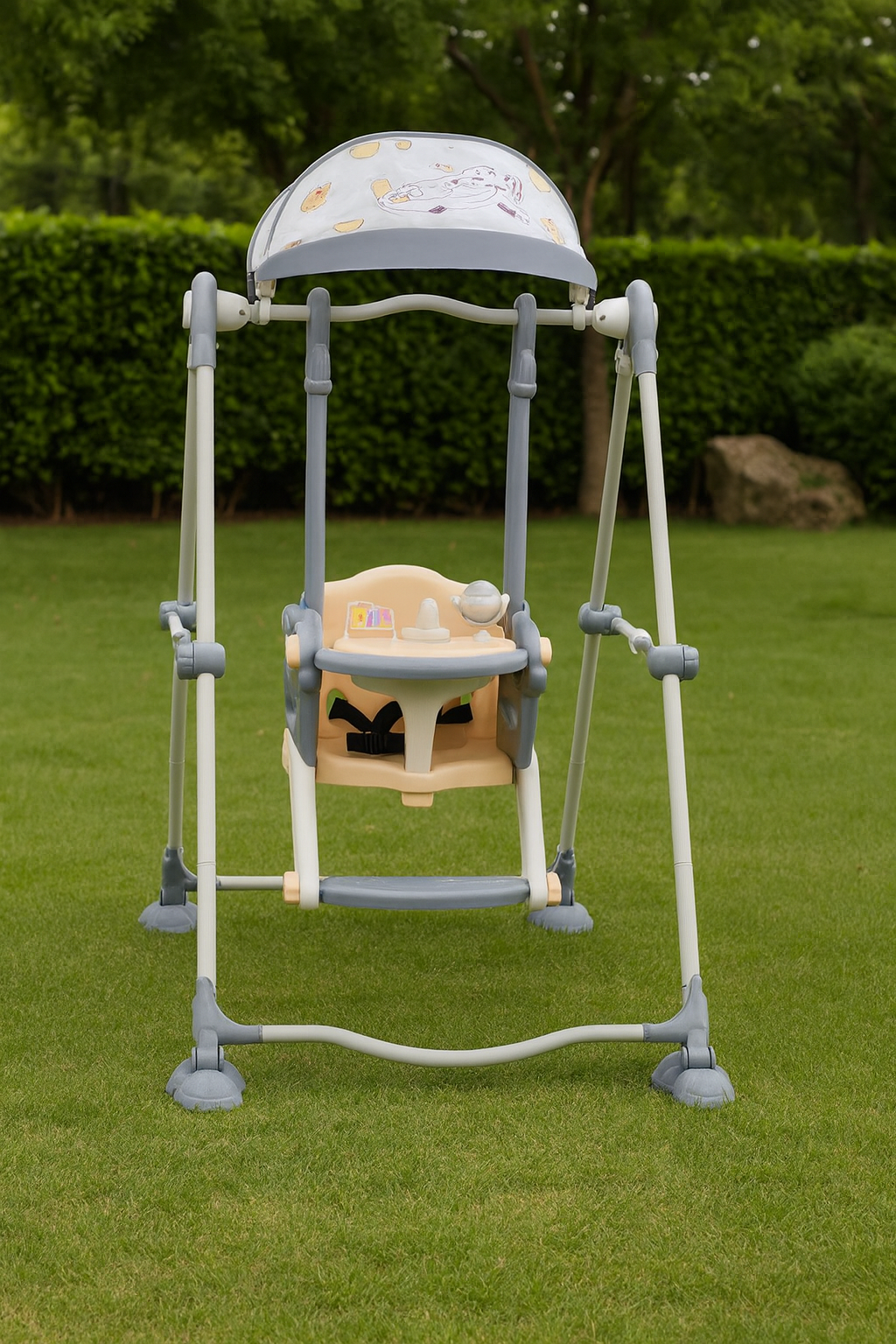 أرجوحة أطفال عملية وأنيقة باللون الوردي مع مظلة واقية، مصممة لتوفير تجربة لعب ممتعة وآمنة للطفل. تتميز بمقعد مريح مزود بحزام أمان، وطاولة أمامية مع ألعاب ترفيهية تشجع على تنمية المهارات الحركية والبصرية. هيكل معدني قوي مع قواعد ثابتة لزيادة الاستقرار، ما يجعلها مثالية للاستخدام في المنزل أو الحديقة.