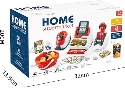 اللعبة تحتوي على ماكينة كاشير إلكترونية، قارئ كروت، سكانر، أموال ورقية ومعدنية، منتجات غذائية وهمية وسلة تسوق ممتعة.