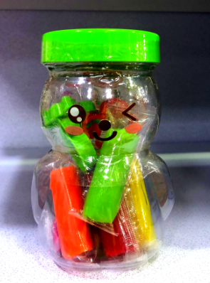 عبوة بلاستيكية شفافة على شكل شخصية كرتونية مبتسمة بغطاء لونه أخضر جذّاب. تحتوي على مجموعة من ألوان الشمع الأساسية والفرعية، مناسبة للأطفال لمحبي التلوين والرسم، ومصممة خصيصًا لتكون آمنة وسهلة الحمل والاستخدام.