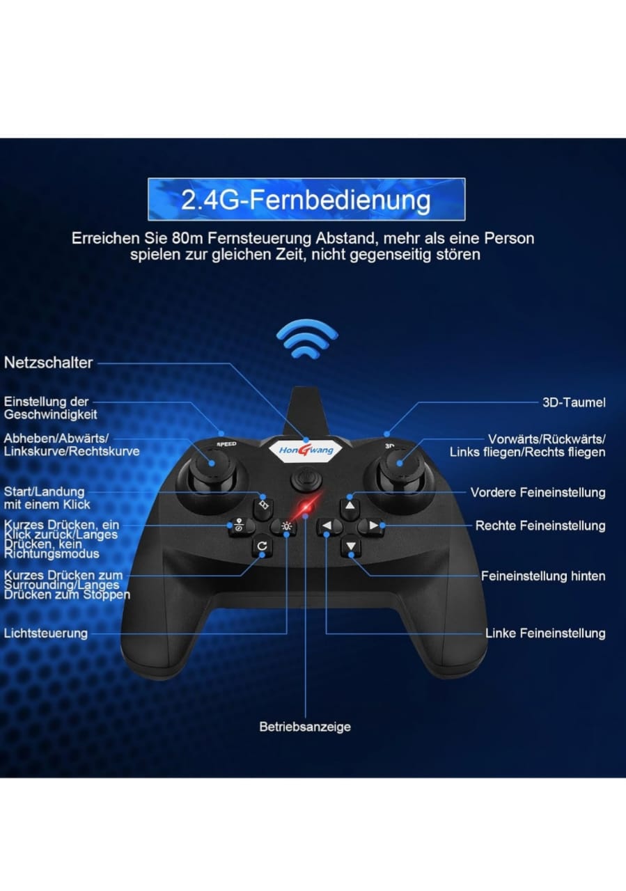- قدرات جهاز التحكم عن بعد: يوفر نظام التحكم عن بعد بتردد 2.4 جيجاهرتز نقلًا ثابتًا للإشارة يصل إلى 80 مترًا، مما يسمح برحلات متعددة في وقت واحد دون تداخل