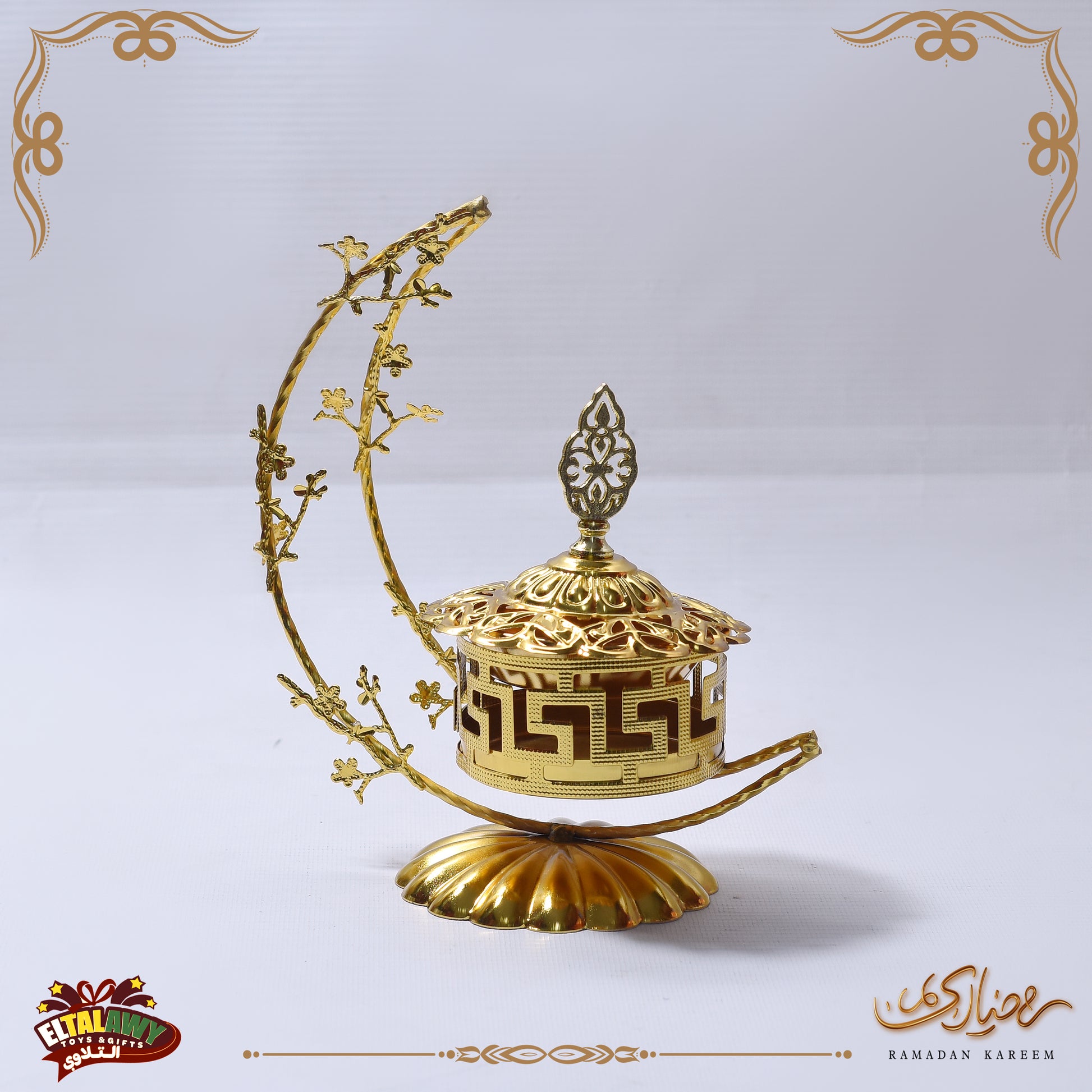 مبخرة أنيقة بتصميم إسلامي راقي باللون الذهبي، محفور عليها نقوش وزخارف مميزة مع شكل الهلال في الأعلى، بتدي لمسة فخامة وروحانية لأي مكان.